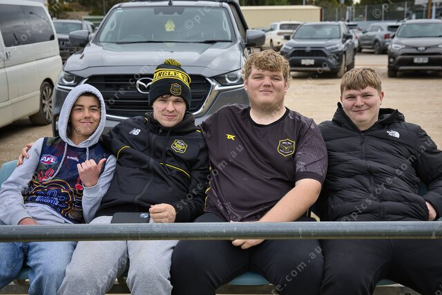 Tye Clark, Zach Thiel, Mason Roberts and Logan Harris supporting Angle Vale at Saturday’s football. (Michael Slattery: 492517_01)