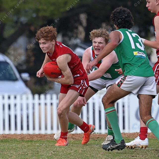 Two Wells’ Hartley Bailley tries to break away from Reece Knevitt. (488588_01)