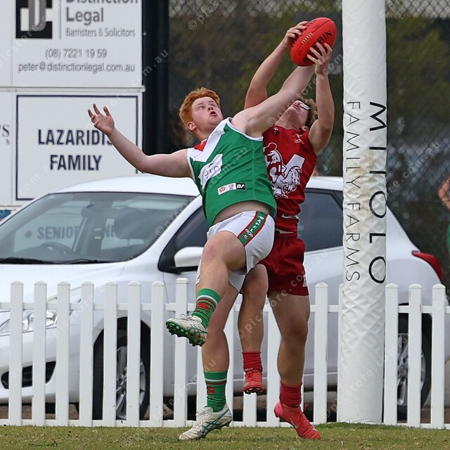 Two Wells’ Pearce Girdham gets two hands on the footy as Bentley Hopgood tries to drag it in one-handed. (488588_04)
