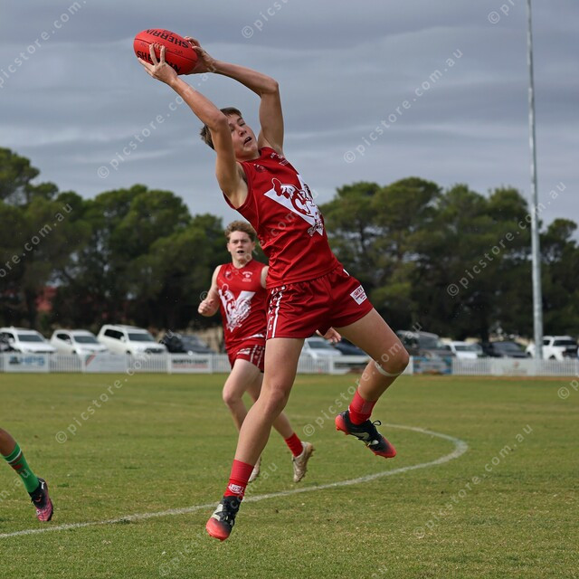 Lachlan Spencer marks at half-forward for Two Wells. (488588_06)