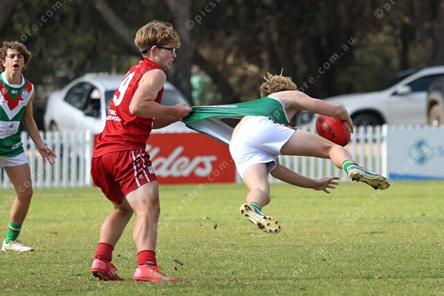 Pearce Girdham gets Cruz McKechnie airborne in a strong tackle. (488588_09)