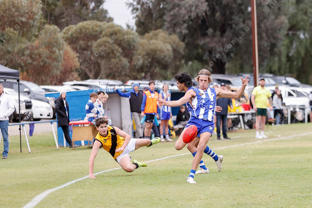 Zy Longman is sent flying by a great shepherd from Jermaine Miller, freeing up South Gawler’s Jake Harris to kick inside-50. (488598_01)