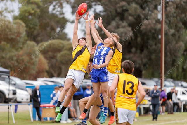 Gawler Central’s Alex Friebel and South Gawler’s Raysharn Davey go up at the front of the pack. (488598_02)