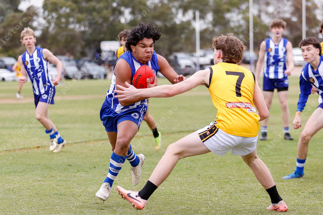 Jermaine Miller looks to fend off the incoming tackle from James Starr. (Mark Willoughby: 488598_03)
