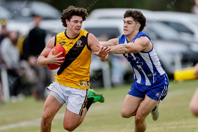 South Gawler’s Ryder Schilds lunges at Alex Friebel as he gallops down the wing. (488598_10)