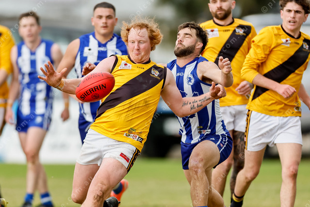 Gawler Central’s Adam Byster snaps a kick out of the contest as Anthony Bullock applies a tackle. (488602_03)