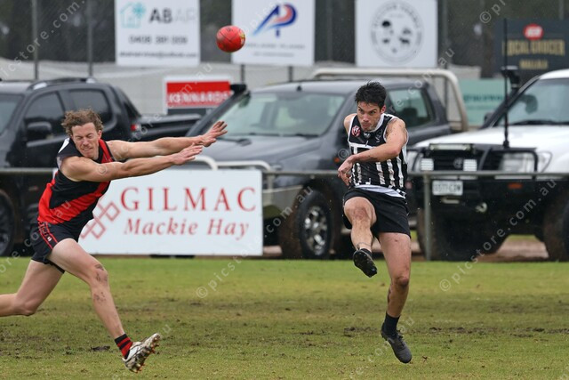 Toby Maughan kicks away as Patrick Winter attempts to smother. (484431_06)