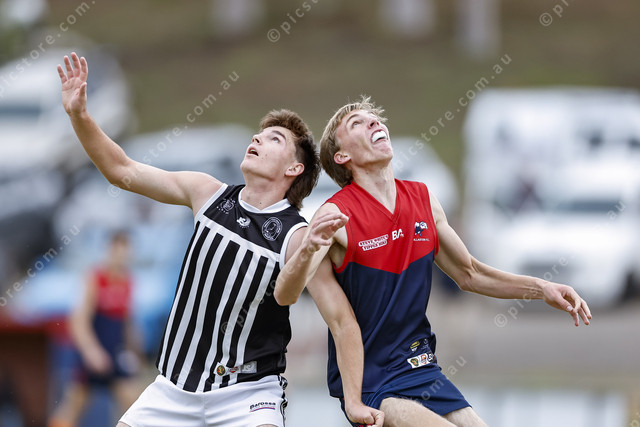 Noah Schulz and Henry Hunter lock up in a ruck duel. (484423_07)