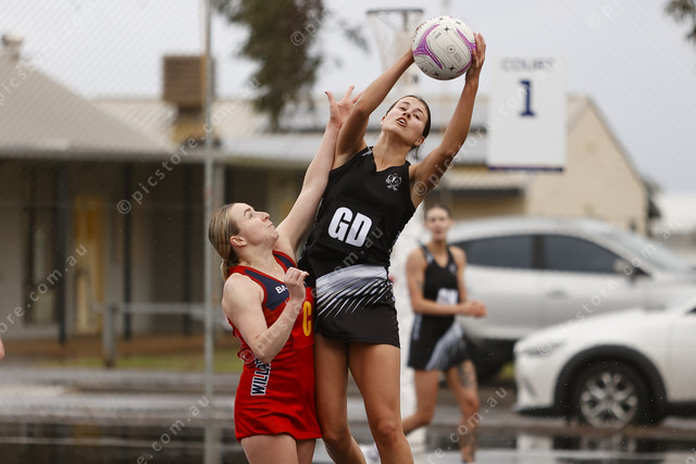 Tanunda’s Chloe Petersen rises well to beat Caitlin Muhs to the ball. (484549_04)