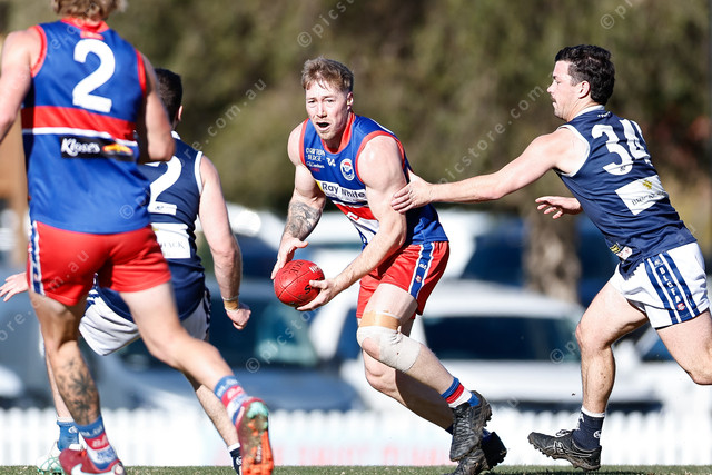 Barossa District’s Ben Cummings looks to get a handball away before the tackler arrives. (Mark Willoughby: 486068_02)