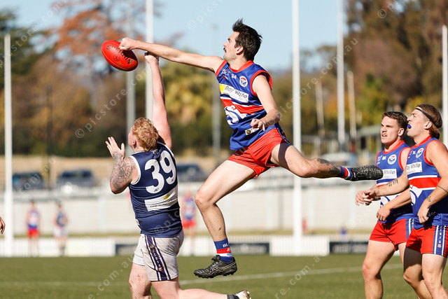 Barossa District’s Patrick Grigg comes over the top with a big spoil on Jaylen Wallace. (Mark Willoughby: 485977_02)