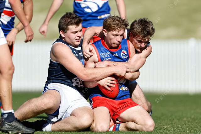 Barossa District’s Jamie Gerschwitz is gang-tackled by Connor Waechter and Riley Argent. (485977_03)