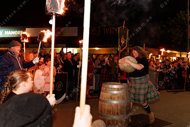 A member of the Tartan Muscle lifting a heavy stone for the crowd. (485842_23)