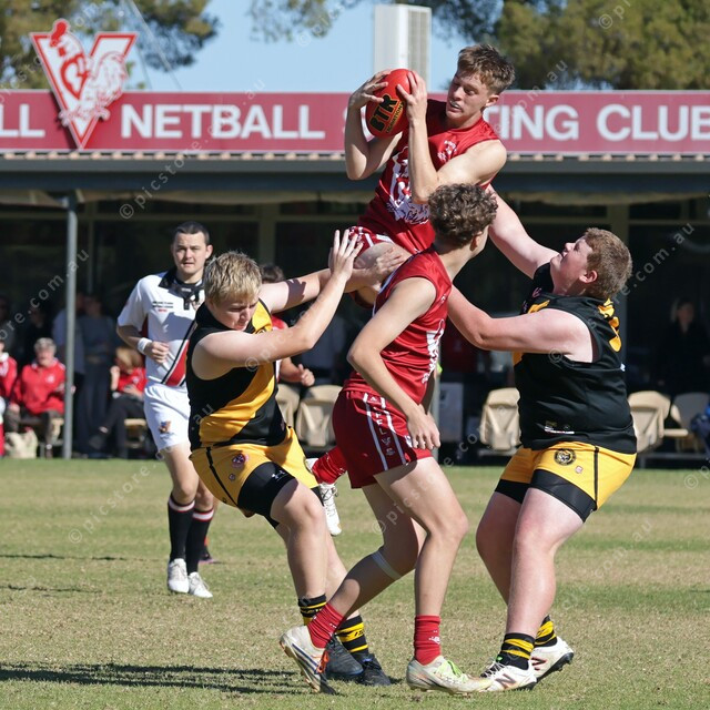 Two Wells’ Riley Ansell sits on top of the pack for a contested mark. (Michael Slattery: 481642_01)