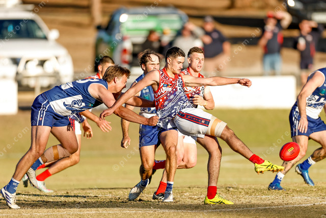Angaston’s Jonte Reimann pulls down Heath Growden as he gets his kick away. (482146_05)