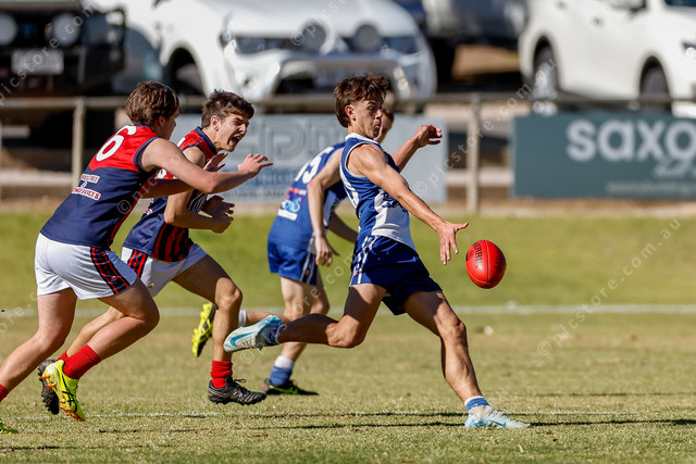 Angaston’s Liam Kurtz slices through the middle of the ground with Riley Nottle and Steffen Gouws in pursuit. (481619_02)