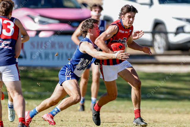 Angaston’s Mitchell Harvey lays a tackle on Oliver Barrass. (481619_03)