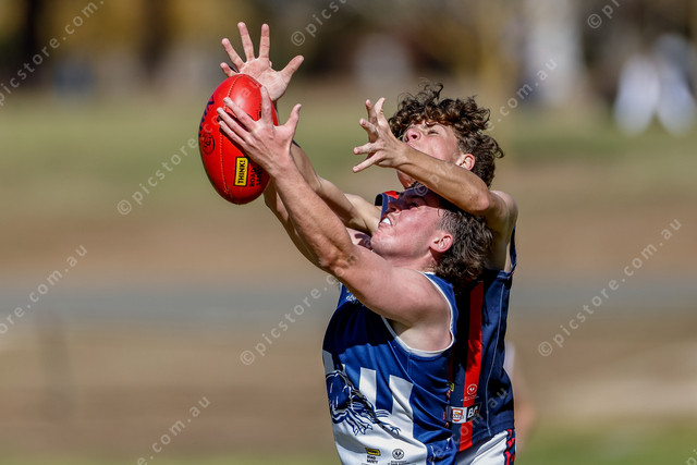 Angaston’s Mason Lade hangs onto a strong mark as Brayden Hicks tries to come over the top. (481619_05)