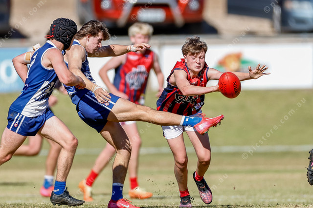 Jay Ellery attempts to smother the kick from Mitchell Harvey. (481619_08)