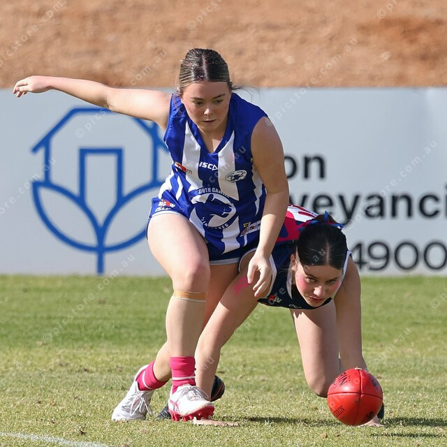 South Gawler’s Harper Eaton races Angaston’s Claire Davidson to the loose ball. (481766_01)