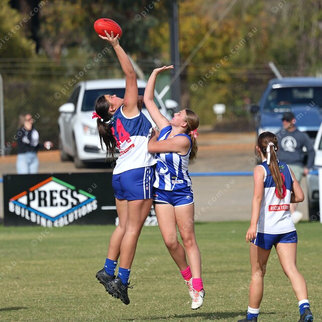 Angaston’s Elise Chapman wins the hit-out against South ruck Lara Hemer. (481766_02)