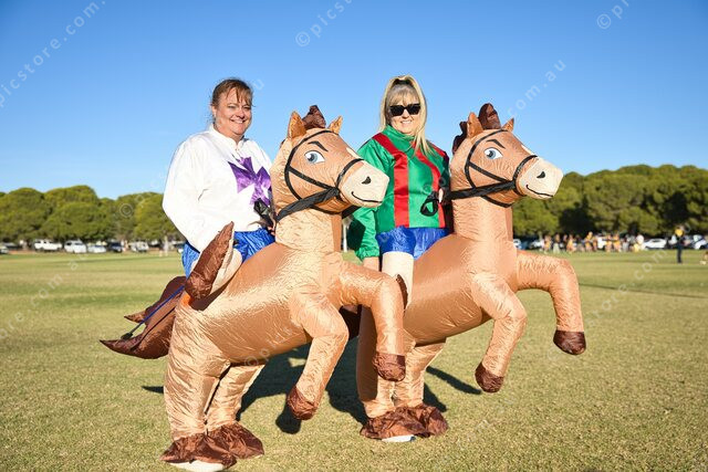 Mel Wilson and Kelly Newman getting into the spirit of Two Wells’ Derby Day theme for Ladies’ Day. (481614_05)
