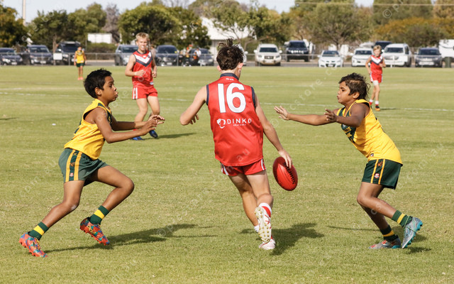 Hayden Gameau kicks for Tasman Imperial between Mallee Park opponents Jarrell Jackamarra and Lucas Hull in the under 14s. (476730_08)