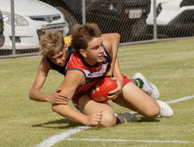Mallee Park player Levi Miller brings Tasman Imperial’s Oliver Haylock to the ground. (476730_20)