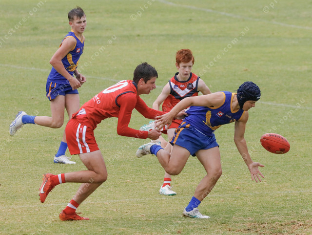 Tasman Imperial’s Sam Lydeamore and Logan Rawling chase Lincoln South’s Isaac Ambados in the under 17s. (479157_06)