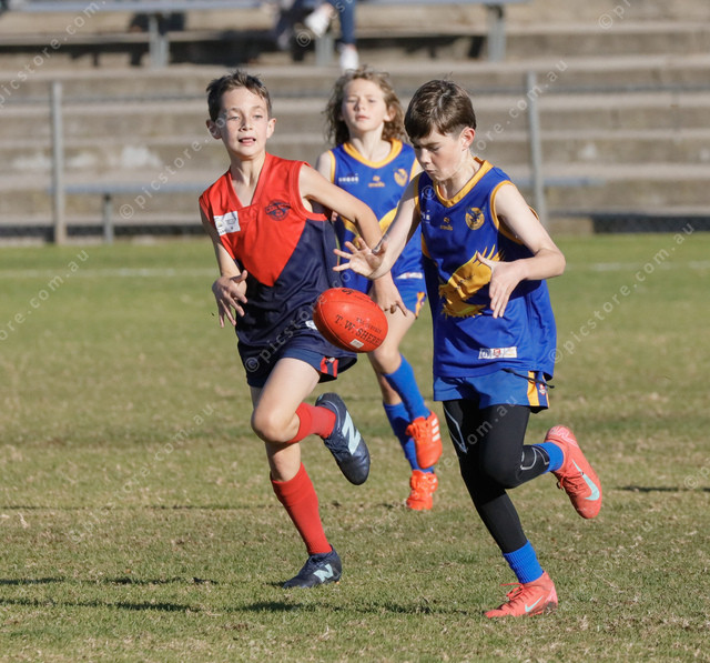 Fletcher Elton is about to kick for Lincoln South in the under 12s. Wayback’s Hudson Robst gives chase. (Jack Davies: 486619_01)