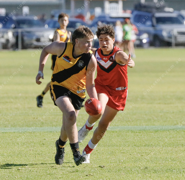 Boston’s under 17 player Drazzik Stusser looks for a teammate to handball to as Tasman Imperial’s Sonny Burns closes in. (486619_06)