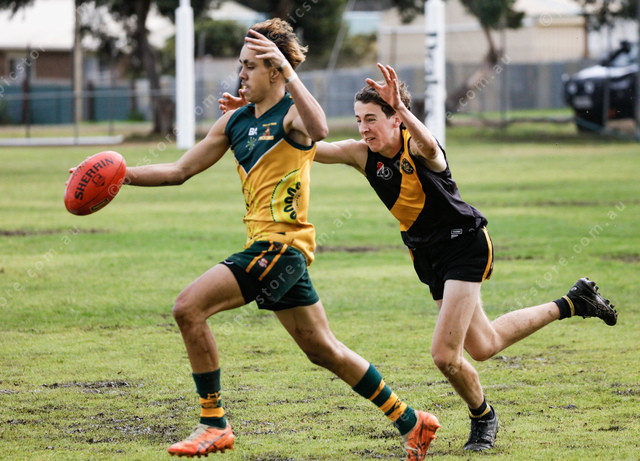 Mallee Park’s Jyezaiah Cook is about to kick as Boston’s Finn Crawford closes in with a tackle in the under 17s. (493313_05)