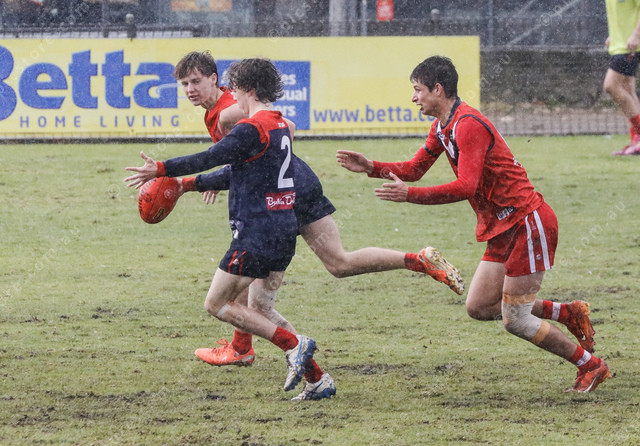 Wayback’s Oakley Reidy is about to get boot to ball in heavy rain, under pressure from Tasman Imperial’s Sam Lydeamore. (493313_06)