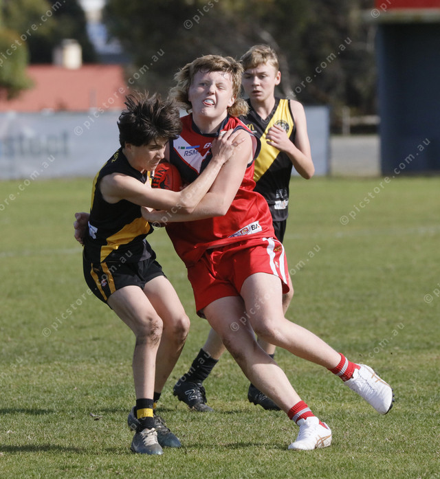 Boston’s Judd Hammond-Polkinghorne and Tasman Imperial’s Leo Schmidt attempt to win the ball for the teams. (496087_03)