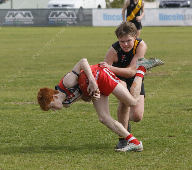 Tasman Imperial’s Logan Rawling tries to break away from Boston player Drazzik Stusser. (496087_06)