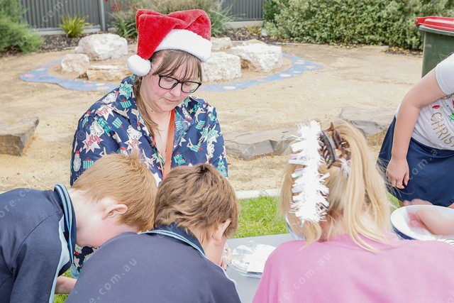 Naomi Nielsen helps create button badges for the children. (523378_05)