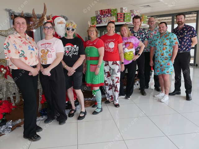 Ken Mills Toyota Kingaroy team in their Christmas outfits. (Daniel Pelcl) 524011_01