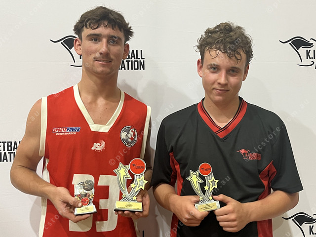 Under 17 boys MVP and best on court in the grand final Billy Brind, and runner-up MVP Baxter Howard. (Maggie’s Photography: 464431_06)