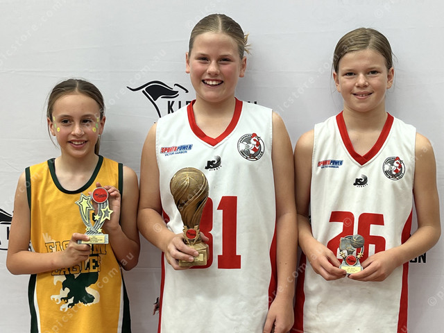 Under 12 girls MVP Georgia Wurst, runner-up MVP Hallie Linke, and best on court in the grand final Annabelle Stanton. (Maggie’s Photography: 464431_11)