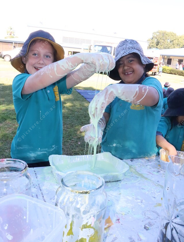Macie from 2B and Niya from Year 2 enjoy the slime. 480024_01