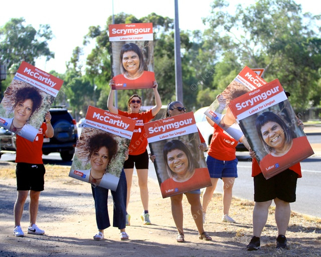 EARLY: Even before the Federal election has been called, Labor supporters have been out with candidates corflutes near the Milner Road roundabout on Larapinta Drive. (PIC: PHIL WILLIAMS 464161_02