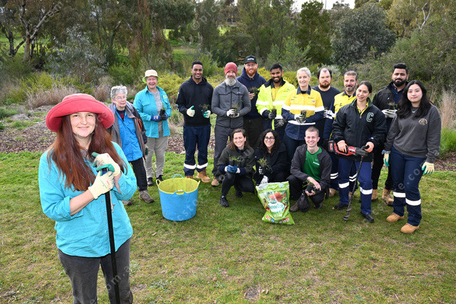 Pic of Jessica Gerger president of Friends of Kororoit Creek (front) with FKC volunteers and volunteers from AusNet. (Damjan Janevski). 494711_05