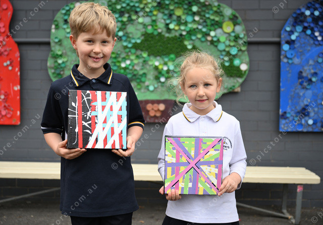 St Mary’s Primary School students Lukas and Maci, aged 8 and 6, with their artwork. (Damjan Janevski). 515642_01