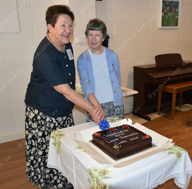 Founding Visitor Information Centre volunteers Julie Thomson and Rhonda Pech cut the celebratory cake. (517693)