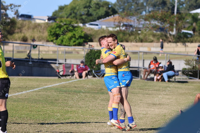 Yeppoon’s Zac Sainsbury comes in to celebrate Jesse Johnson’s try.