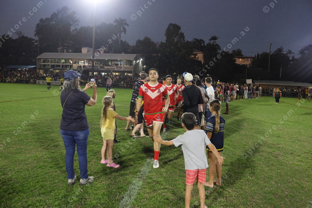 Emu Park’s captain-coach Tiko Hooper leads his troops out onto the battlefield.