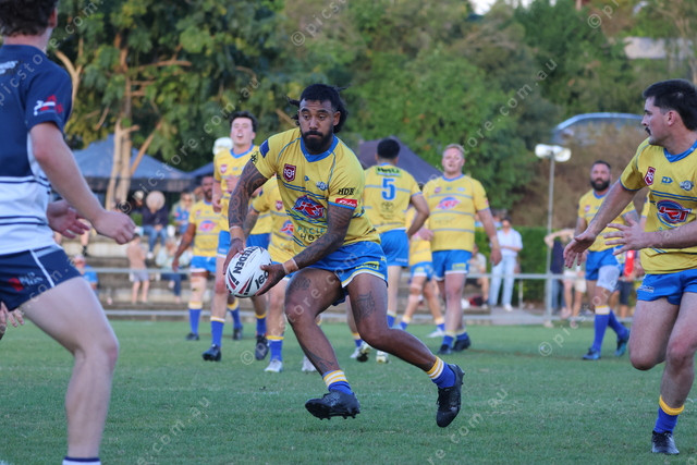 Yeppoon’s Darnel Pirere holds out the footy shaping a pass.