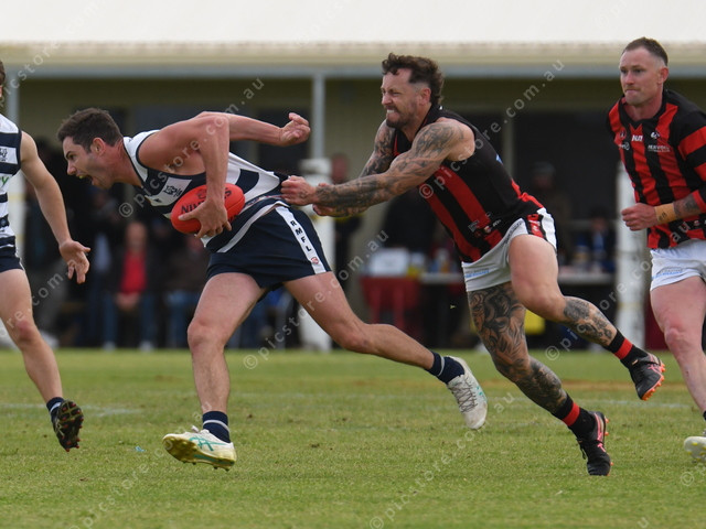 Taite Silverlock, Jervois, chases Daniel Menzel, Coorong Cats, holding his jersey as he carries the ball. (William Bailey: 505475)