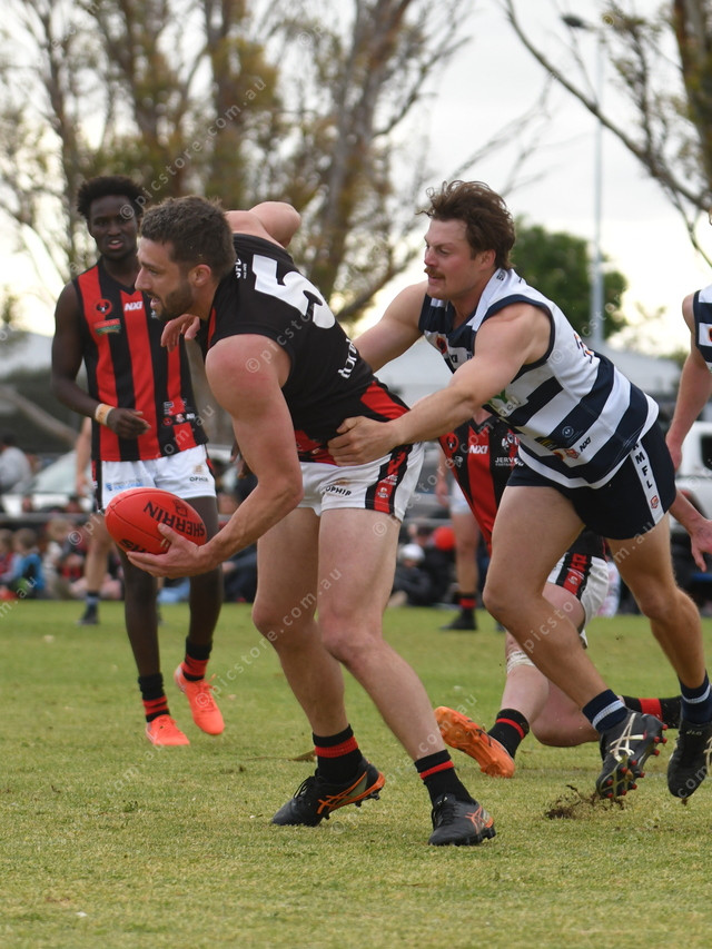 “Peter Zarantonello, Jervois, attempts a handball while Alex Stidiford, Coorong Cats, comes in from behind. (William Bailey: 505475)