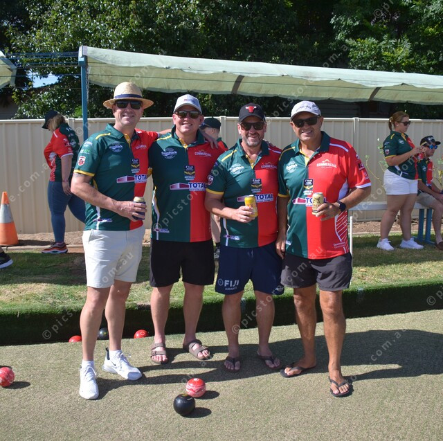 Rhys Collins (Sunpork sponsor), Legend Ben Hannant, Ben O’Callaghuan (Commercial Hotel sponsor) and Legend Terry Matterson team up for bowls. 461664_01